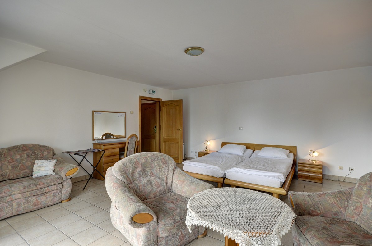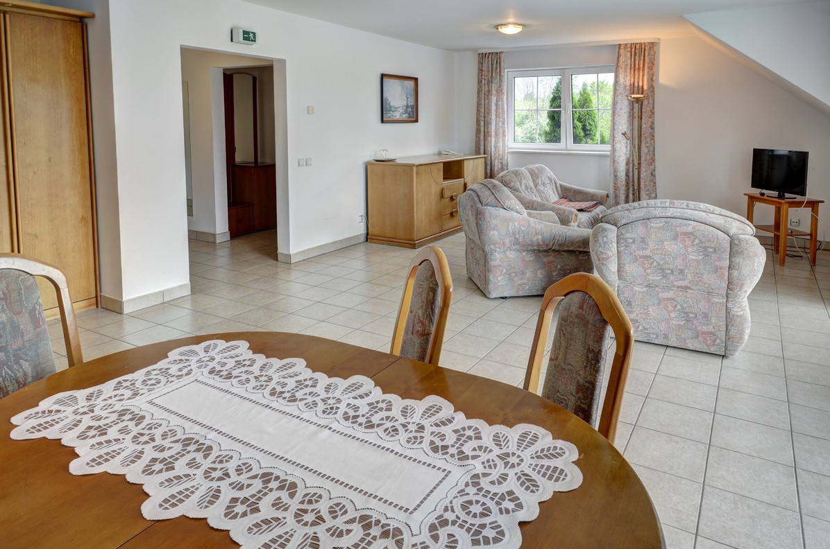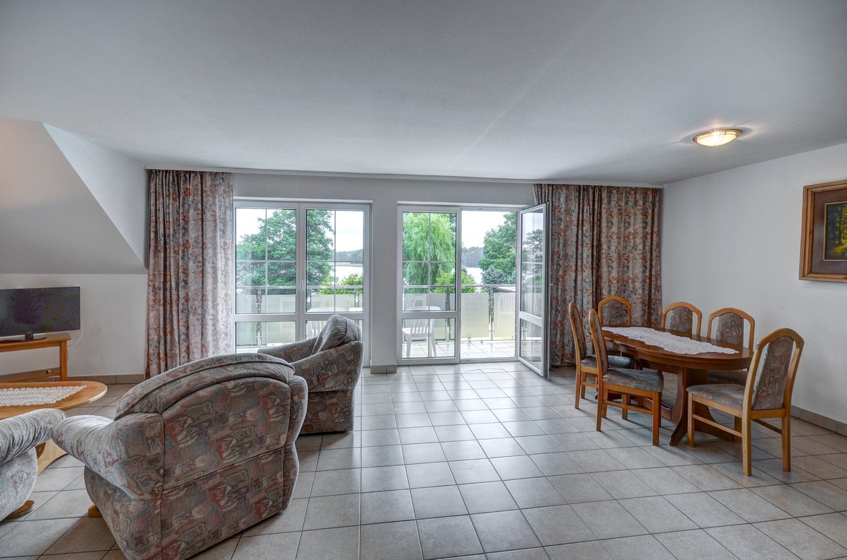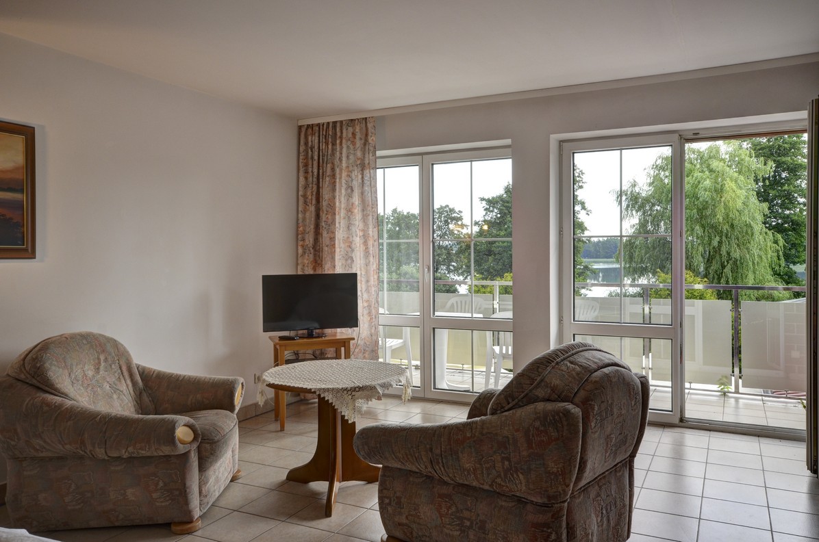 - su sulankstomu stalu, terasa (vaizdas į ežerą), 6 kėdės, spinta, šifonas, 2 ištraukiamos lovos, 2 foteliai, sofa, palydovinė televizija, telefonas, seifas, šaldytuvas